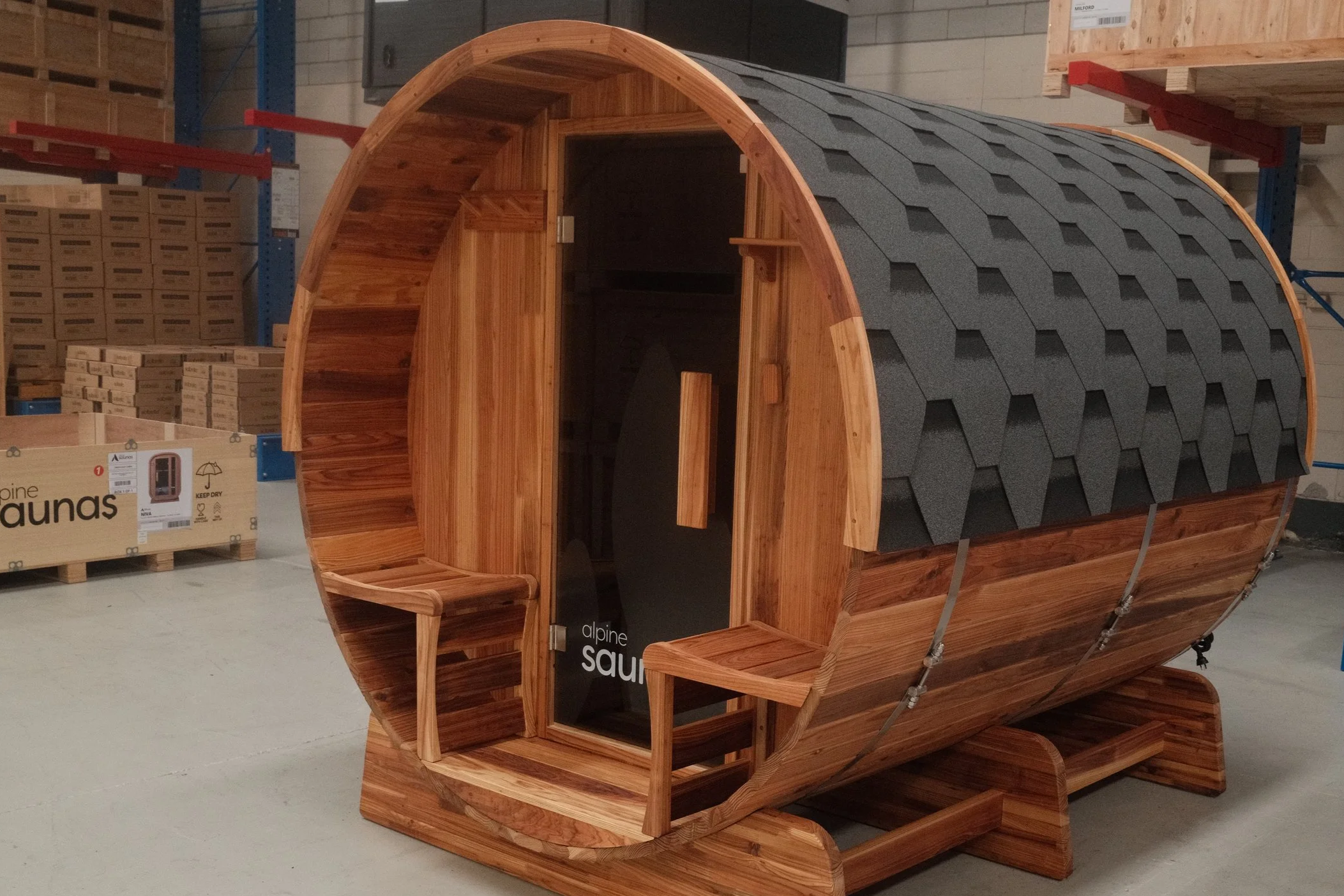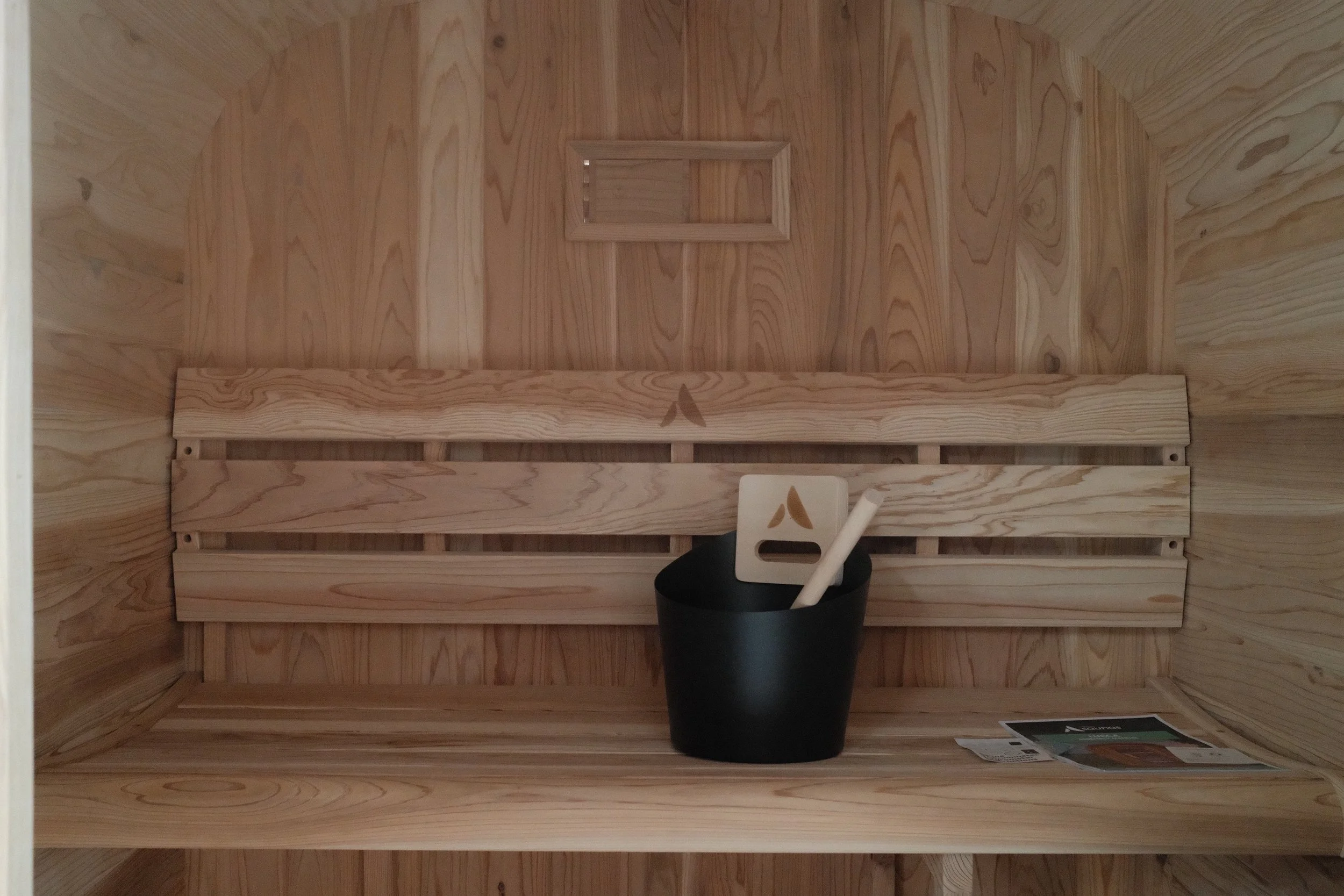 Full-service outdoor sauna installation, including metro delivery, professional assembly, exterior oiling, and complete site clean-up. An exterior top coat is applied for enhanced durability and weather resistance.